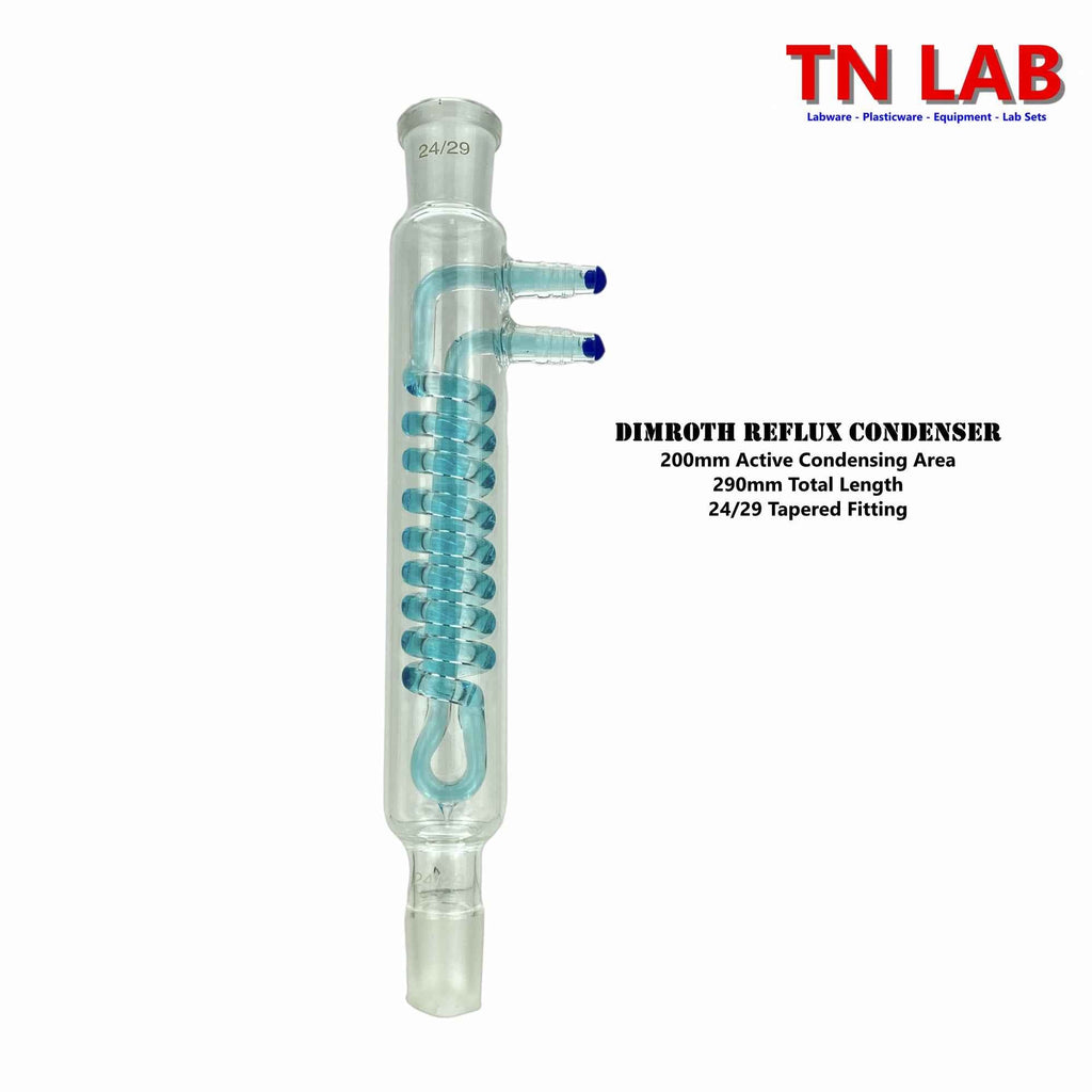 TN LAB Dimroth Reflux Condenser is made of Borosilicate 3.3 glass. Cooling liquid enters the condenser from the lower hose connection, moves down to the bottom of the coil,  flows through the tightly wrapped inner coil and exits from the top hose connection. Vapors rise and condense inside the outer tube from the cold coils, the reverse of many conventional coiled condensers, often viewed as more efficient.